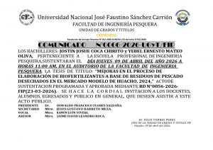 SUSTENTACIÓN DE TESIS: EL DÍA JUEVES 09 DE ABRIL DEL AÑO 2026 A HORAS 11:00 AM, EN EL AUDITORIO DE LA FACULTAD DE INGENIERIA PESQUERA,
